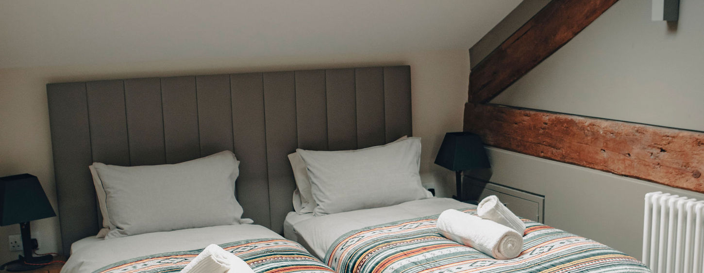 Our Hayloft barn is spacious with a double-height living space and a large kitchen, cosy barn bedrooms, one on the lower floor, and one upstairs with a Velux window. Hayloft has two double/twin ensuite bedrooms that can be booked with someone else or privately should you wish.